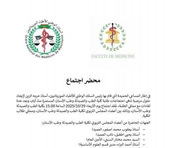 أعلن السلك الوطني لأطباء موريتانيا التوصل إلى اتفاق ينهي إضراب طلاب كلية الطب والصيدلة وطب الأسنان المستمر منذ أيام، بعد وساطة بين الطلاب وإدارة الكلية.