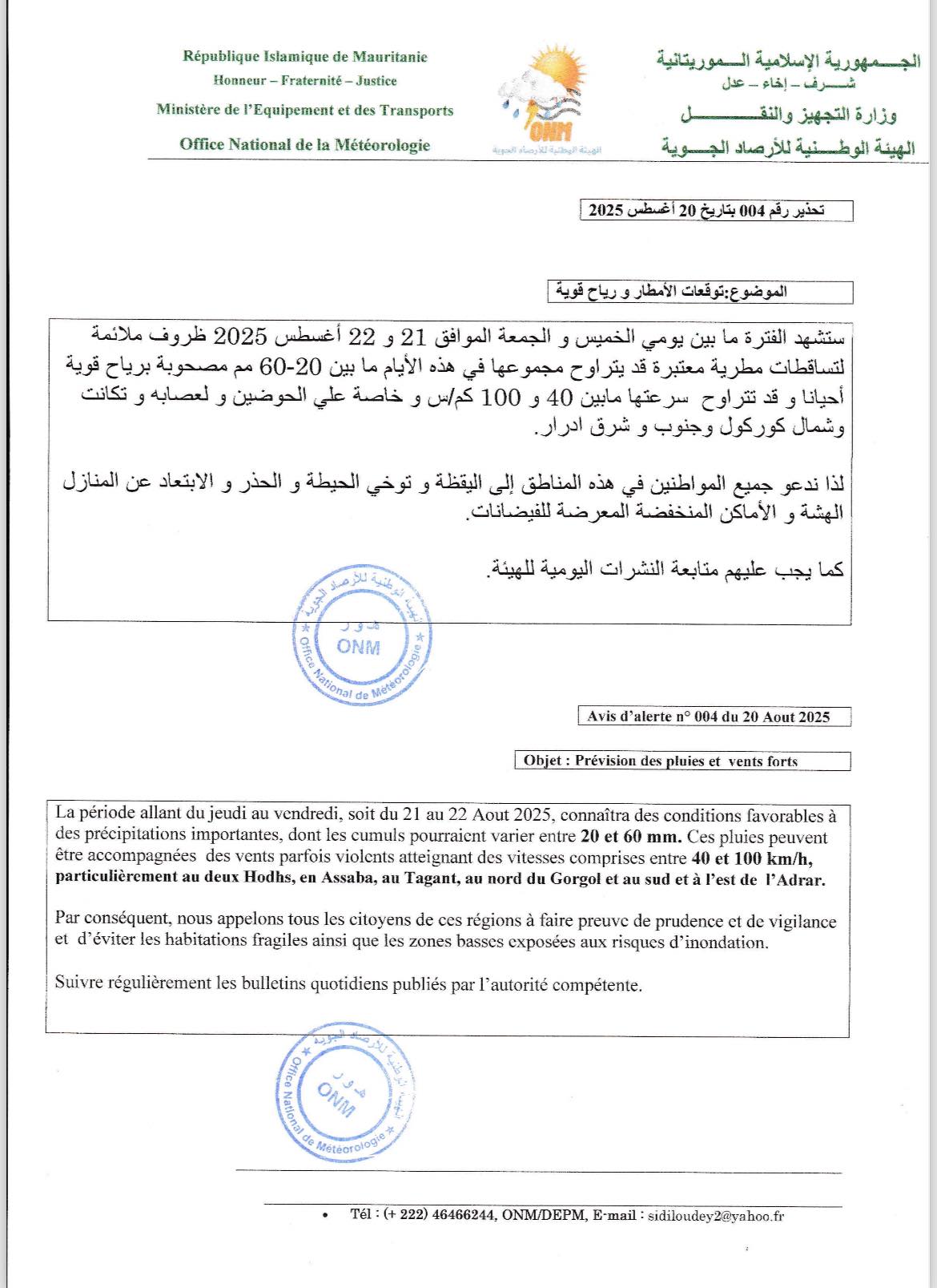 وقالت الهيئة في تحذير لها، إن الظروف ستكون ملائمة لتساقطات مطرية معتبرة مصحوبة برياح قوية أحيانا، على الحوضين ولعصابه وتكانت وشمال كوركول وجنوب وشرق آدرار.