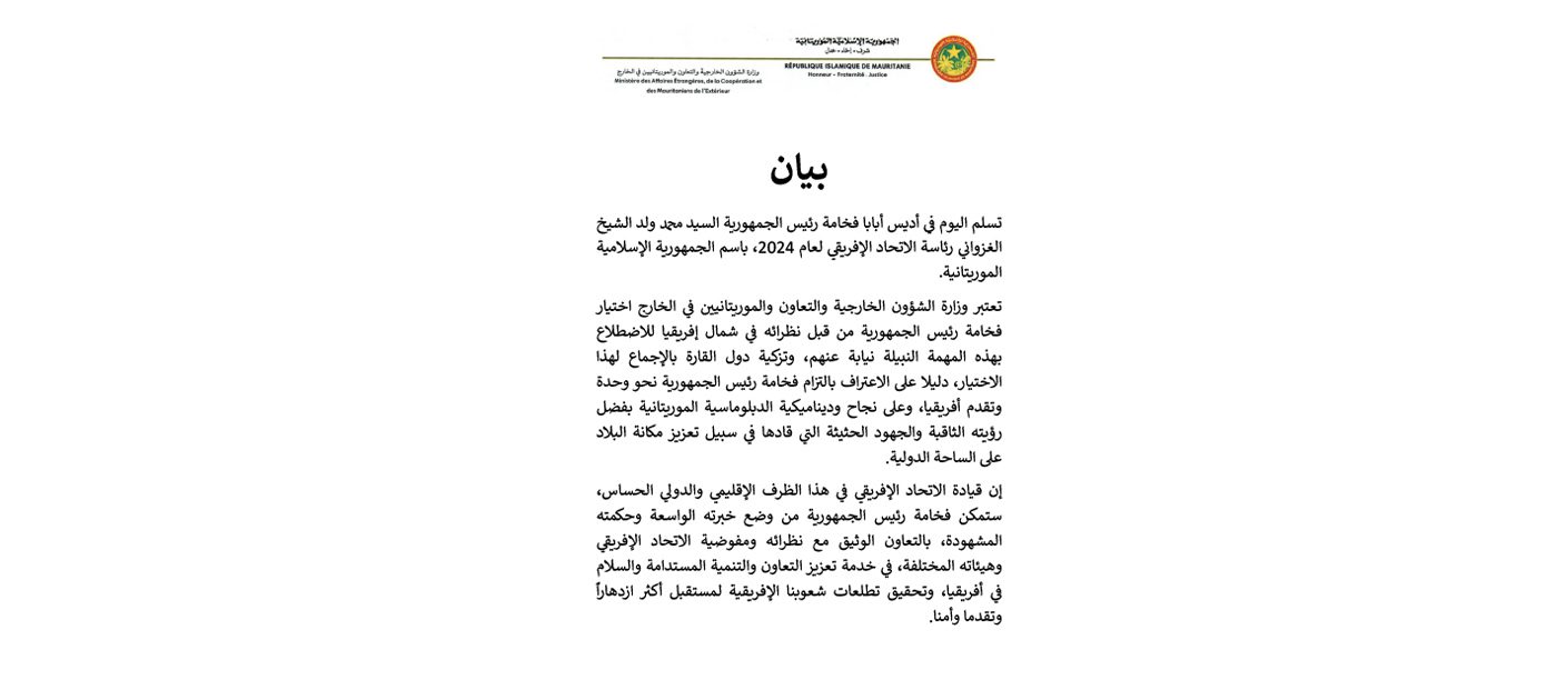 اعتبرت وزارة الشؤون الخارجية والتعاون والموريتانيين في الخارج أن اختيار فخامة رئيس الجمهورية السيد محمد ولد الشيخ الغزواني لتولي رئاسة الاتحاد الافريقي من طرف نظرائه في شمال أفريقيا وتزكية الاختيار بالإجماع من طرف دول القارة دليل على الاعتراف بالتزام فخامته نحو وحدة وتقدم أفريقيا، وعلى نجاح وديناميكية الدبلوماسية الموريتانية.