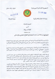 أصدر وزيرا الداخلية واللا مركزية محمد أحمد محمد الأمين، والزراعة آدم بوكار سوكو تعميما مشتركا ألزما بموجبه ولاة الولايات باتخاذ كافة الإجراءات الضرورية لاستغلال كل المساحات القابلة للزراعة بالمناطق المطرية والواحاتية على عموم التراب الوطني.