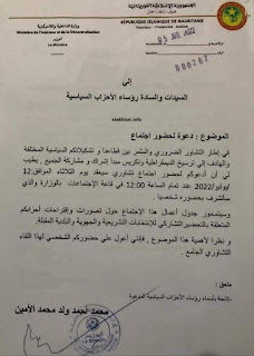 وجه وزير الداخلية واللا مركزية محمد أحمد ولد محمد الأمين دعوة لرؤساء الأحزاب السياسية بهدف التشاور "حول التحضير التشاركي للانتخابات التشريعية والجهوية والبلدية المقبلة".