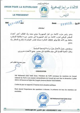 دعا رئيس حزب الاتحاد من أجل الجمهورية الحاكم، سيدي محمد ولد الطالب أعمر، جميع أعضاء المجلس الوطني للحزب، إلى الحضور، يوم الأحد القادم، لدورة طارئة يعقدها المجلس في قصر المؤتمرات القديم بنواكشوط.