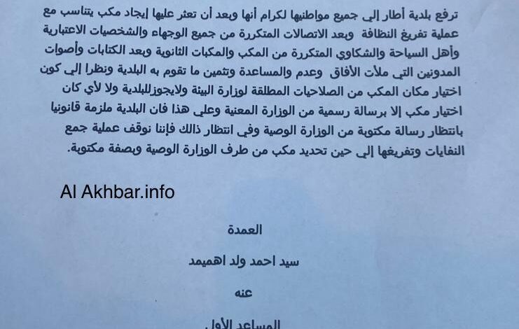 ووفق إعلان وقعه بالنيابة العمدة المساعد للبلدية الشيخ ماء العينين سعدبوه، فإن عملية التوقف جاءت على خلفية اتصالات وشكاوى متكررة من مكب النفايات الأصلي والمكبات الفرعية، تقدم بها “الوجهاء والشخصيات الاعتبارية وأهل السياحة” بالبلدية.