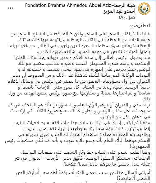 هاجمت هيئة الرحمة الخيرية التي يرأسها بدر ولد عبد العزيز نجل الرئيس السابق محمد ولد عبد العزيز مدير الديوان الرئاسي محمد أحمد ولد محمد الأمين، ووصفته بأنه "شخص فارغ مثقل بأمراضه النفسية وفشله المتراكم وقلبه المريض".