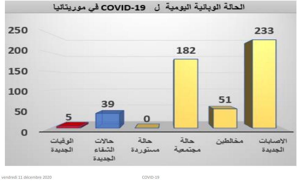 سجلت موريتانيا اليوم الجمعة 5 وفيات جراء فيروس كورونا المستجد، فيما سجلت أعلى عدد من الإصابات في يوم واحد منذ بداية الجائحة، حيث وصل عدد المصابين 233 شخصا.