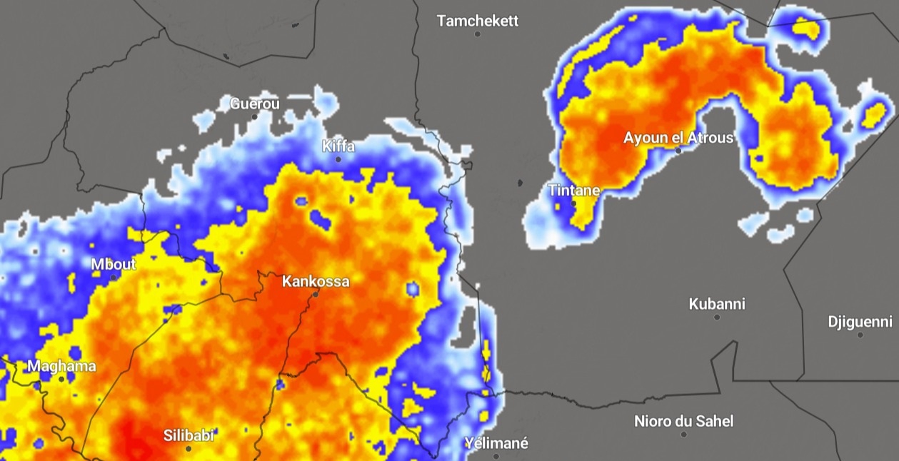 انتشرت سحب ماطرة ضحى اليوم شمال ولاية الحوض الغربي، وتتحرك نحو الغرب باتجاه جنوب وجنوب غرب تكانت، وشمال البراكنة، فيما يتوقع أن تصل إلى بعد نحو ساعتين إلى منطقة بو امديد في ولاية العصابة.