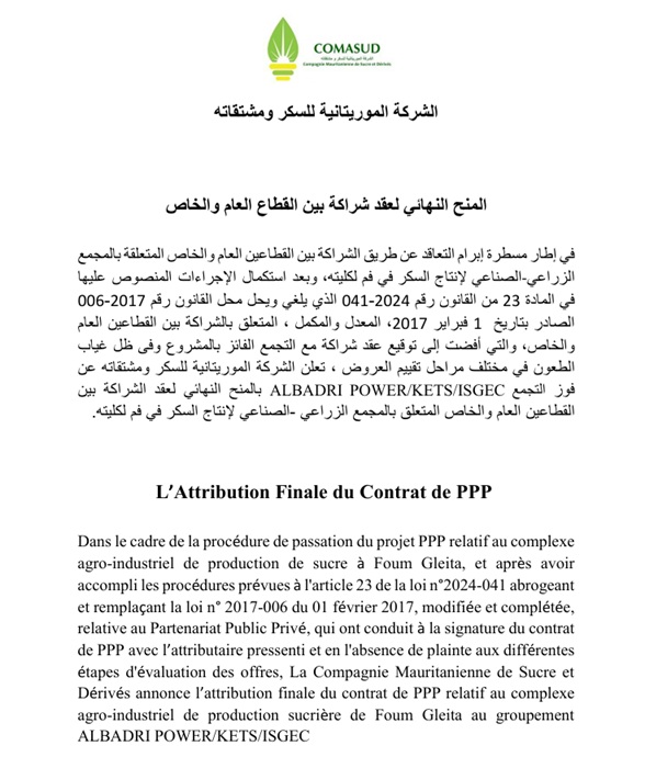 أعلنت الشركة الموريتانية للسكر ومشتقاته عن منح العقد النهائي للشراكة بين القطاعين العام والخاص لتنفيذ مشروع المجمع الزراعي الصناعي لإنتاج السكر في فم لكليته.