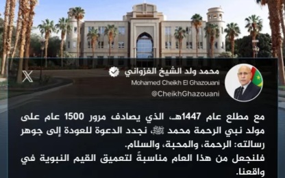 ودعا ولد الغزواني خلال تغريدة على حسابه «أكس» الشعب إلى اتخاذ هذه الذكرى لتعميق القيم النبوية في واقع الأمة.