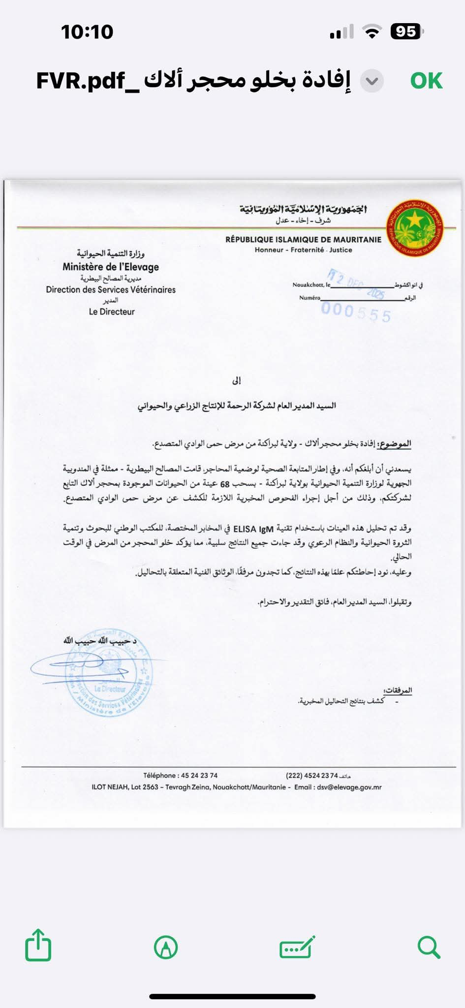 8في إطار المتابعة الصحية للوضعية الوبائية لمرض حمى الوادي المتصدع، أعلنت اليوم الاثنين 15/12/2025 إدارة المصالح البيطرية بوزارة التنمية الحيوانية عن خلو محجر ألاك، التابع لشركة الرحمة للإنتاج الزراعي والحيواني بولاية لبراكنة، من مرض حمى الوادي المتصدع.
