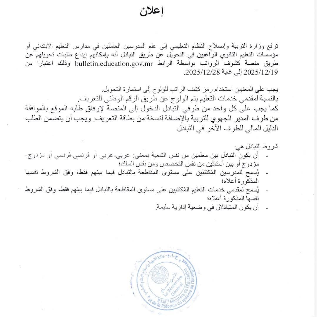 الأخبار (نواكشوط) – قالت وزارة التجهيز والنقل إن المصالح المختصة للشرطة الوطنية ستباشر ابتداءً من يوم الخميس الموافق 25 دجمبر 2025، العمل بالنظام الرقمي الجديد الخاص برصد وتسجيل المخالفات المرورية.