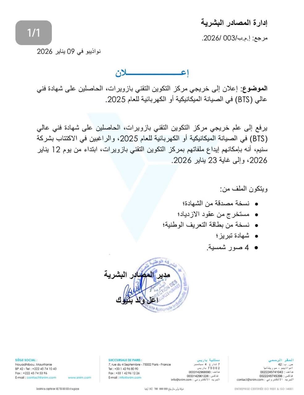 أعلنت إدارة المصادر البشرية في الشركة الوطنية للصناعة والمناجم "سنيم" عن فتح باب الترشح للاكتتاب أمام خريجي مركز التكوين التقني بالزويرات.
