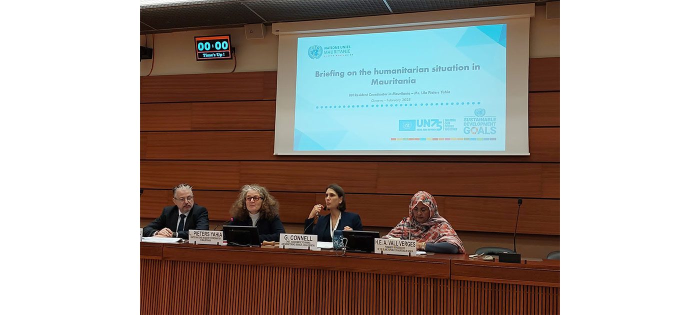في إطار جلسة إحاطة حول الوضع الانساني في موريتانيا التأمت اليوم الجمعة في جنيف برئاسة السيدة جيما كونيل، رئيسة قسم التقييم والتخطيط والرصد في مكتب الأمم المتحدة للشؤون الإنسانيّة، حضرها دبلوماسيون ومسؤولون إنسانيون وممثلون عن منظمات دولية، سلطت السفيرة والمندوبة الدائمة لموريتانيا لدى الأمم المتحدة السيدة عيشه فال فرجس، الضوء عل