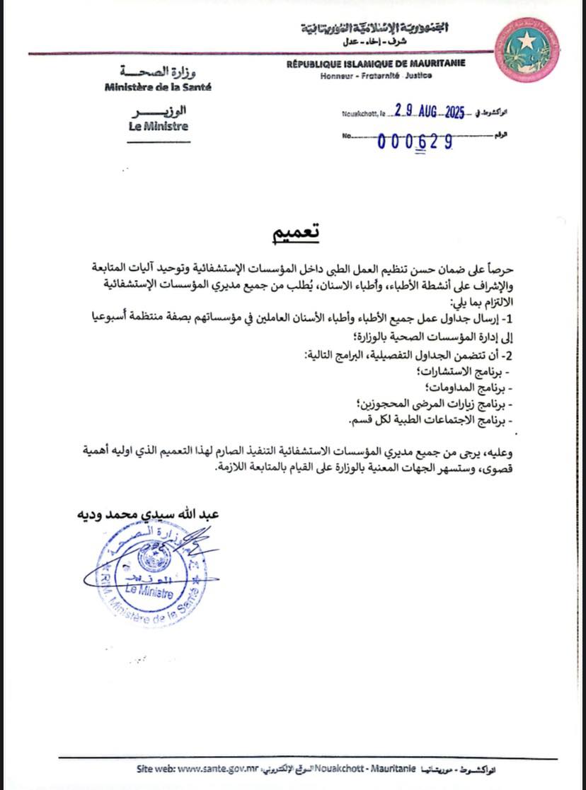 أصدر وزير الصحة عبد الله سيدي محمد وديه تعميما لتنظيم عمل الأطباء وأطباء الأسنان، وذلك عبر إرسال جداول عملهم في مؤسساتهم بصفة منتظمة أسبوعيا إلى إدارة المؤسسات الصحية بالوزارة.