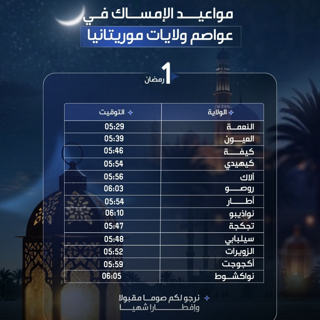 تتراوح أوقات إمساك الخميس فاتح شهر رمضان 1447 في عواصم الولايات الموريتانية ما بين 05:29 دقيقة في مدينة النعمة عاصمة ولاية الحوض الشرقي، و06:10 دقائق في مدينة نواذيبو شمال غربي البلاد.