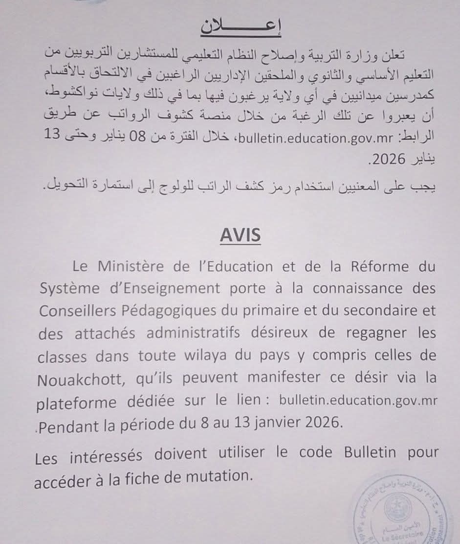 ودعت الوزارة في بلاغ لها الراغبين في الالتحاق بالأقسام كمدرسين ميدانيين في أي ولاية يرغبون فيها بما في ذلك ولايات نواكشوط، أن يعبروا عن تلك الرغبة من خلال منصة كشوف الرواتب عن طريق الرابط: bulletin.education.gov.mr،.
