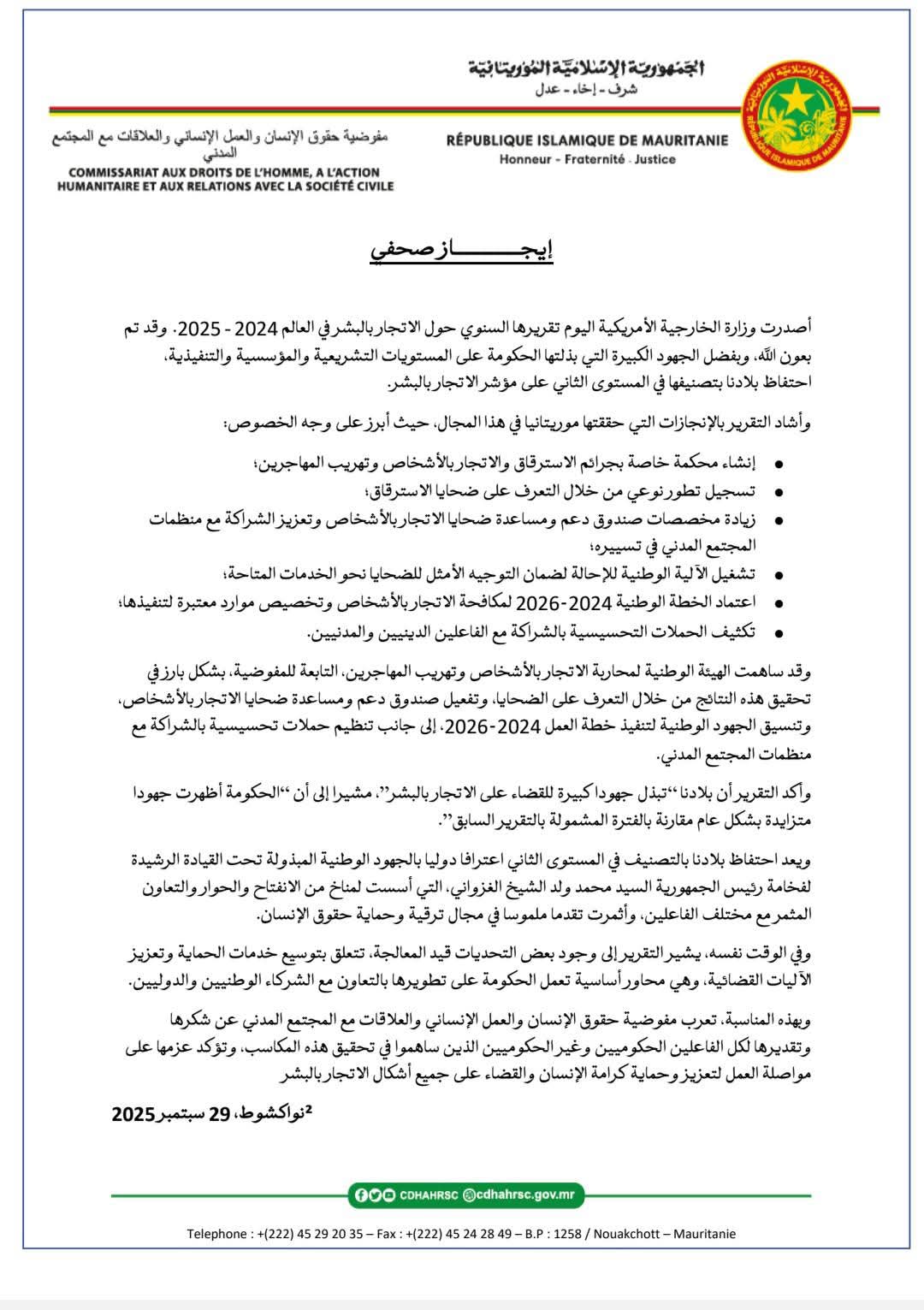 قالت مفوضية حقوق الإنسان والعمل الإنساني والعلاقات مع المجتمع المدني إن احتفاظ موريتانيا بتصنيفها في المستوى الثاني على مؤشر الاتجار بالبشر العالمي للعام 2024-2025، الصادر عن وزارة الخارجية الأمريكية هو اعتراف دولي بالجهود التي تبذلها الحكومة.
