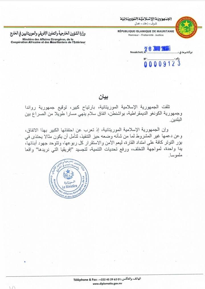 أعربت الجمهورية الإسلامية الموريتانية عن احتفائها الكبير بتوقيع جمهورية رواندا وجمهورية الكونغو الديمقراطية؛ بواشنطن اتفاق سلام ينهي مسارًا طويلاً من الصراع بين البلدين.